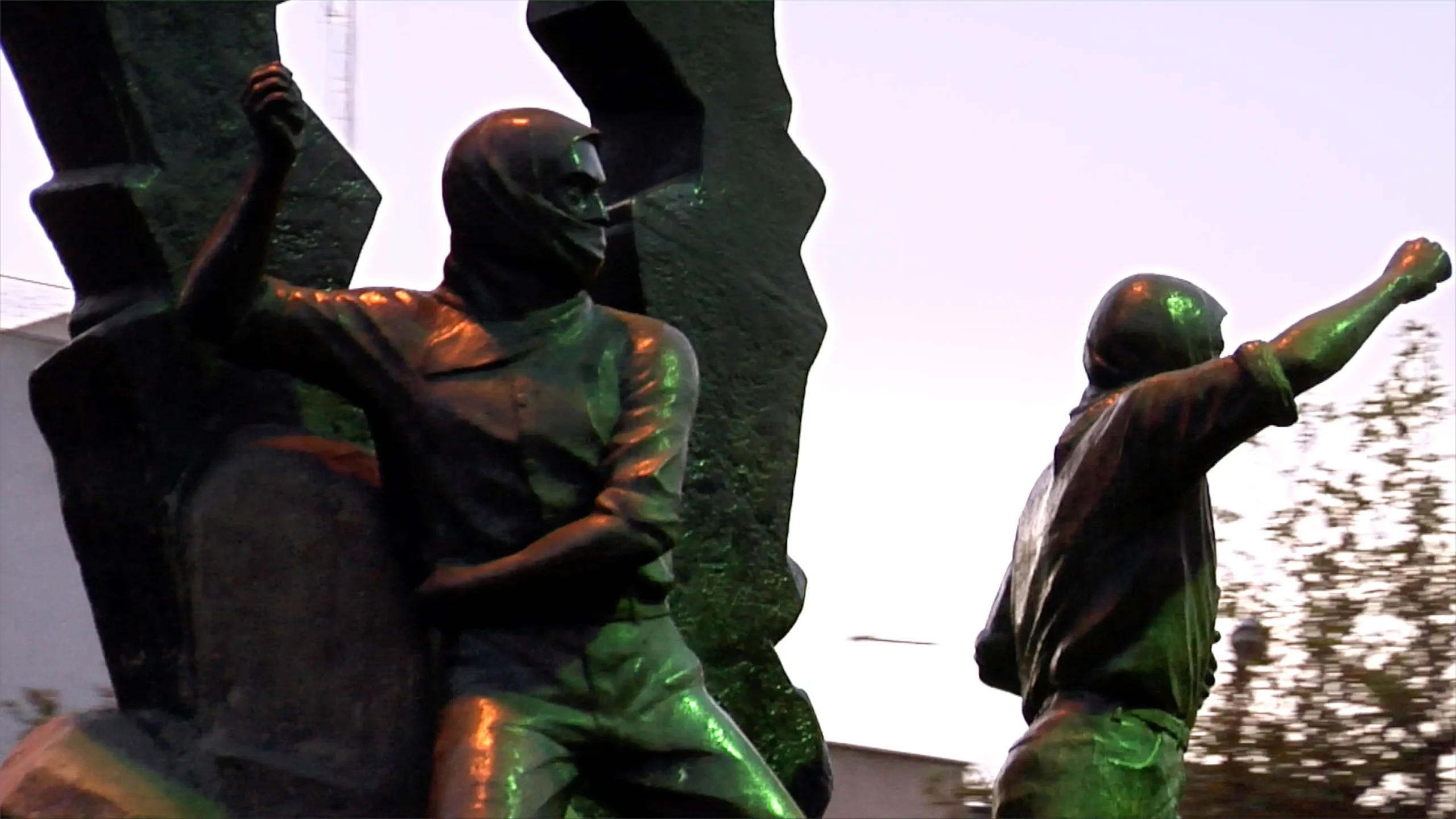 An allegorical bronze-and-cement sculpture stands at the intersection of Felestin (Palestine) Street, in the centre of a large roundabout. Depicting several figures, one with a fist raised in a gesture of defiance, the work is a monument to the Palestinian struggle, particularly the First Intifada. It lasted from December 1987 until the Madrid Conference in 1991, and it was precisely during this period that construction of the monument took place, from 1989 until its inauguration in 1990.