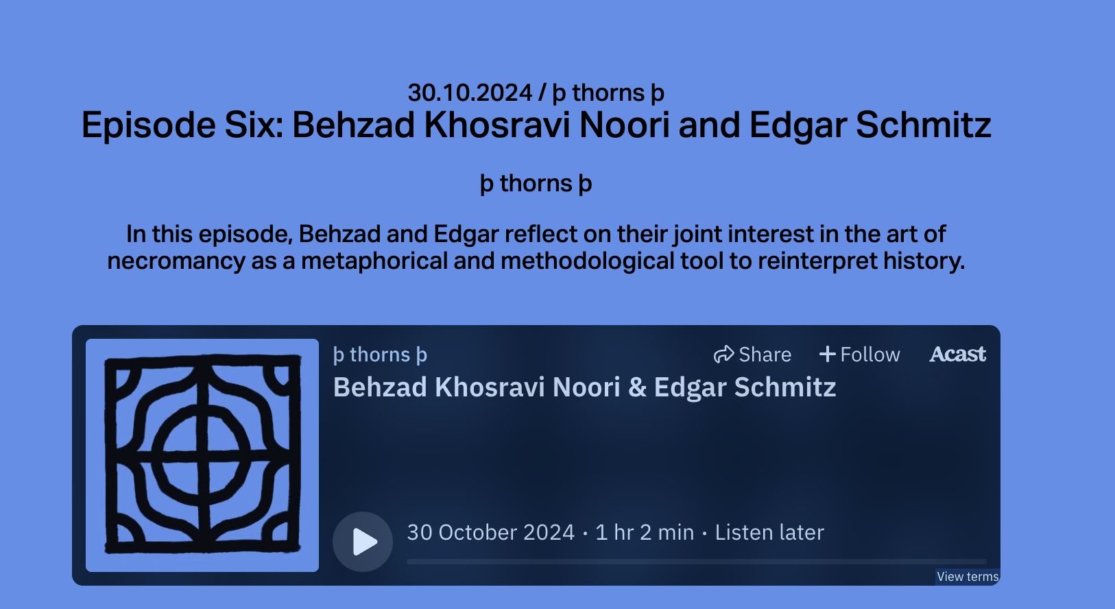 This conversation was recorded in a studio in central London. Edgar and Behzad reflect on their joint interest in the art of necromancy as a metaphorical and methodological tool to reinterpret history. They discuss Behzad’s films on this topic and explore themes like the political distribution of the sensible, decolonisation, the incompleteness of history, and the labour involved in memorialising the past.